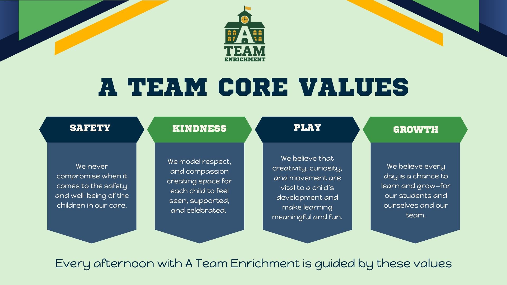 We’re excited to welcome you to A Team Enrichment. You were selected to join our team because we believe you have the potential to be a strong leader, a positive role model for students each afternoon.
